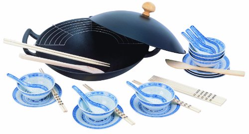 Wok set in cast iron for 6 people. It comes with a lid, a rack and all sorts of accessories. The wok is suitable for all hobs, including induction. Utensil made from cast iron. Cast iron is most often used on its own or is enamelled to seal the cookware and make it attractive. Incredibly durable, cast iron's enormous advantage is its ability to hold heat. Therefore it is often used for woks, tajines, kettles, oven casseroles, etc.