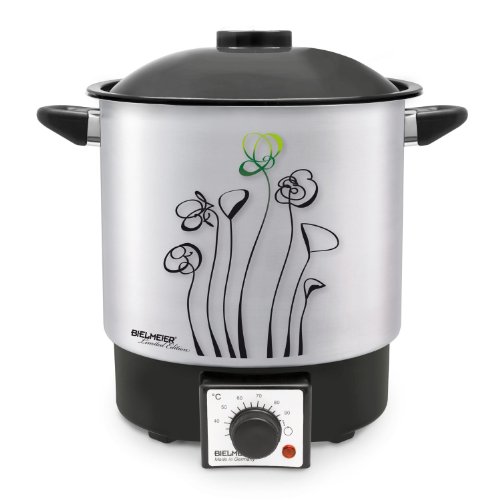 Made in Germany. For preserving and sterilising fruits and vegetables. Can be used wherever an outlet is available. Adjustable thermostat enables constant temperatures. Closed bottom enables use during food preparation. Homemade food without additives, excessive amounts of sugar or flavour enhancers. Model details: BIELMEIER Limited Edition with graphic design. Compact design (9 l capacity) suitable for small kitchens. Brushed 18/10 stainless steel pot. Thermostat adjustable from 30°C to boiling. Indicator lamp. Protection from overheating and dry-running. Convient cable storage integrated in the base.