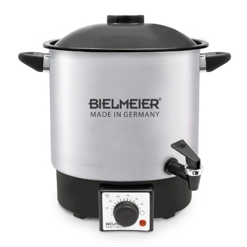 Made in Germany. For preserving and sterilising fruits and vegetables. Can be used wherever an outlet is available. Adjustable thermostat enables constant temperatures. Closed bottom enables use during food preparation. Homemade food without additives, excessive amounts of sugar or flavour enhancers. Model details. Compact design (9l capacity) suitable for small kitchens. Brushed 18/10 stainless steel pot. With 3/8'' platic tap. Thermostat adjustable from 30°C to boiling. Indicator lamp. Protection from overheating and dry-running. Convient cable storage integrated in the base.