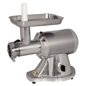 Heavy duty commercial meat mincer with stainless steel hopper, precision gear drive and energy efficient motor with cooling fan. Reverse function for grinding particularly coarse meats.